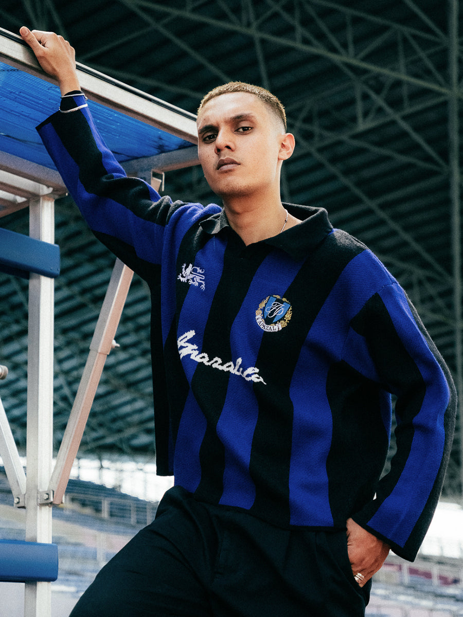 Black and blue stripes knit jersey with embroidered crest, lion motif, and "Apazalclo" logo. “Feito Com Amor” text on the back.